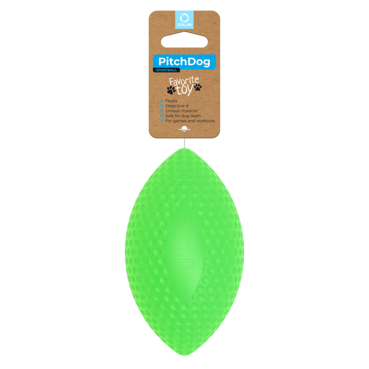 Виконаний у формі М'яка для американського футболу, він ідеально підходить для далеких кидків. Спортивний М'ячик PitchDog гарантує господареві та його собаці активне проведення часу під час прогулянок на природі або ігор на воді. Не варто прибирати іграшку і перебуваючи у приміщенні. Вона допоможе стимулювати рухливість собаки у домашніх умовах. Вихованець з радістю ганятиме М'ячик по підлозі, отримуючи задоволення від непередбачуваної траєкторії руху.