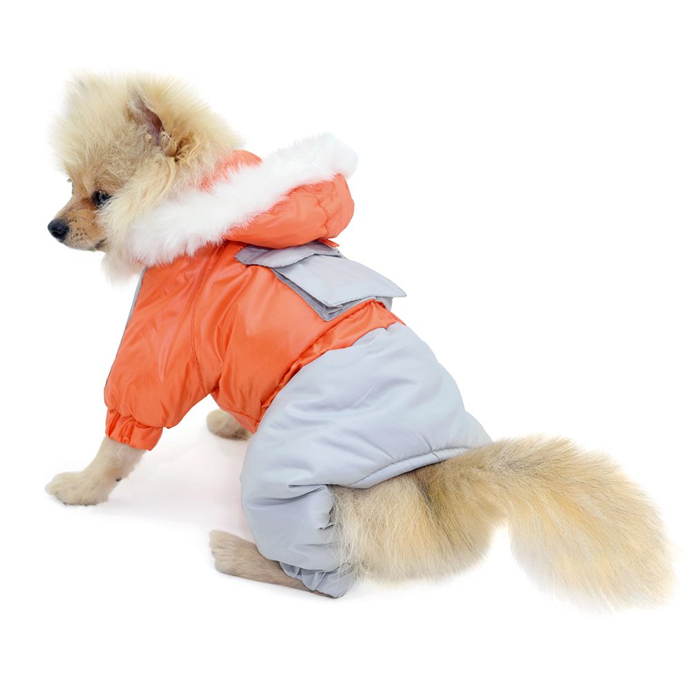 Осінньо-зимовий костюм «Дует» з капюшоном створений спеціально для дрібних та середніх порід. Він виготовлений з м'якої лакової водонепроникної плащової тканини з 1,5 см шаром синтепону + шовкова підкладка. Капюшон оздоблений хутром і може відстібатися. Застібка комбінезона- блискавка на грудях, а на передніх лапах нашита світловідбивна тасьма.