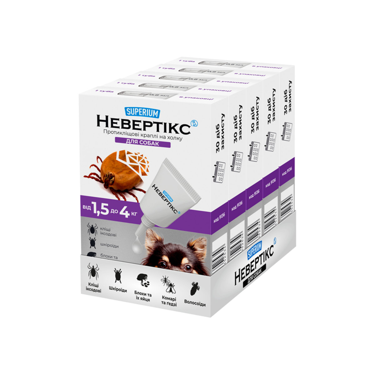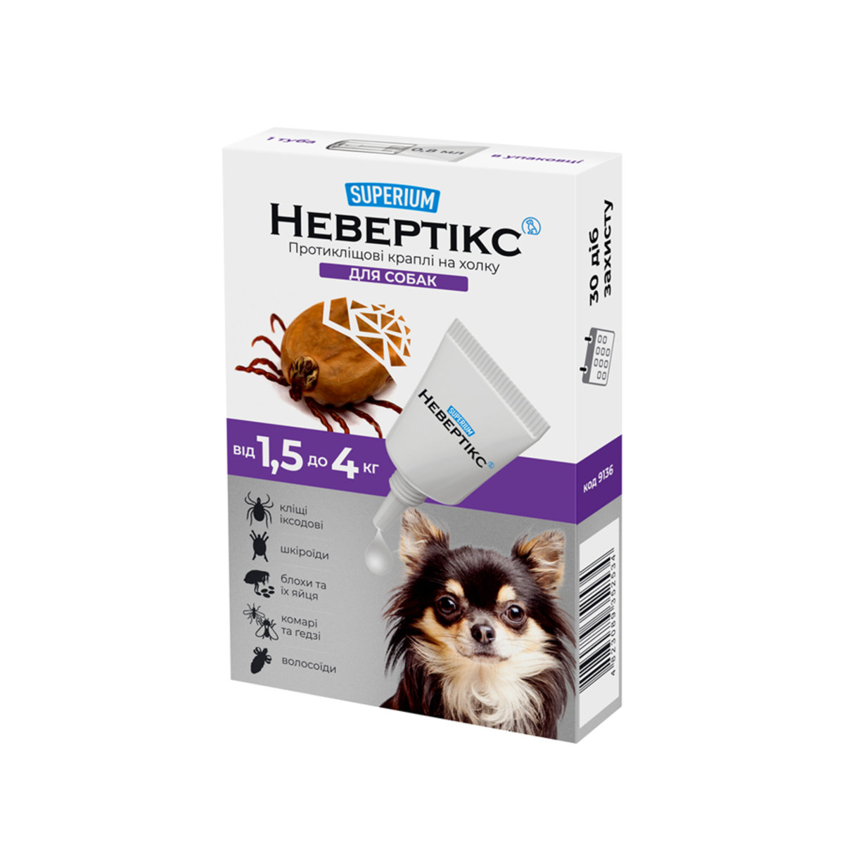 Каталог ВЕТЕРИНАРНІ ПРЕПАРАТИ ДЛЯ СОБАК ТА КОТІВ СУПЕРІУМ НЕВЕРТИКС, ПРОТИКЛІЩОВІ КРАПЛІ НА ХОЛКУ ДЛЯ СОБАК, 1,5-4 КГ